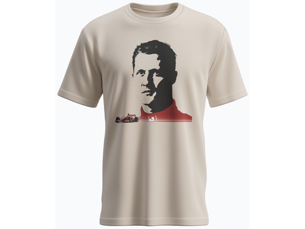 - Nadčasový design: Centrálním prvkem trička je pečlivě zpracovaná silueta Michaela Schumachera, která je okamžitě rozpoznatelná a osloví každého pravého fanouška. Její elegantní provedení vzdává hold jeho charismatu a odhodlání.